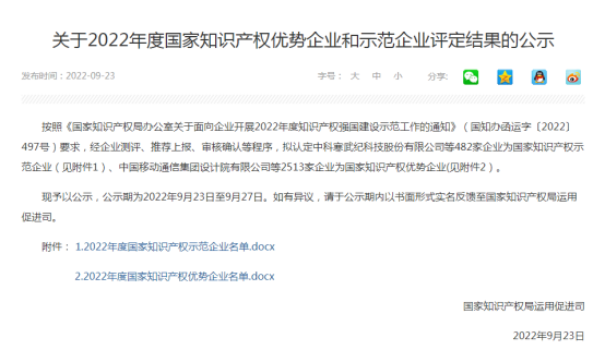 • 9月23日,國家知識產權局公布了“2022年度國家知識產權優勢企業和示范企業評定結果公示”,中材科技榮獲2022年度國家知識產權示范企業。 中材科技自成立以來,始終堅持“科技創新”與“知識產權保護”相結合的原則,規范知識產權管理,促進科技成果轉化。2017年,中材科技成功入選國家知識產權優勢企業名......